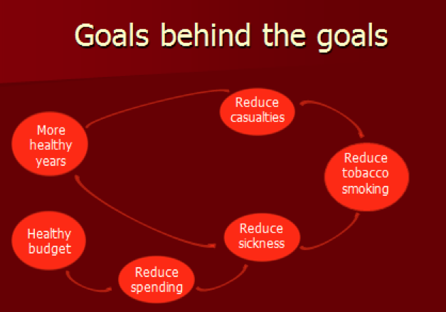 The below illustration from the Handbook, using the example of the policy goal to reduce tobacco smoking, shows that other goals could include: to reduce casualties and to reduce illness. These two goals could be intermediate. For example behind the intermediate goal to reduce sickness another intermediate goal could be identified: to reduce spending and to reduce spending in the health budget.