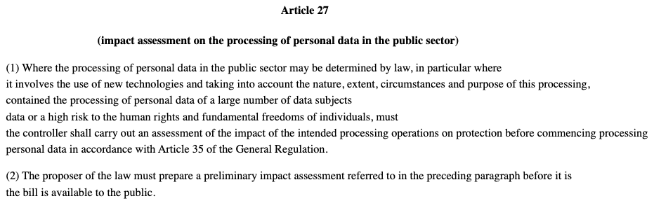Article 35 requires an impact assessment to be completed “[w]here a type of processing in particular using new technologies, and taking into account the nature, scope, context and purposes of the processing, is likely to result in a high risk to the rights and freedoms of natural persons ”. Article 35(7)] outlines the minimum criteria that the impact assessment must consider and assess, such as describing the processing operations, assessing the necessity and proportionality etc.