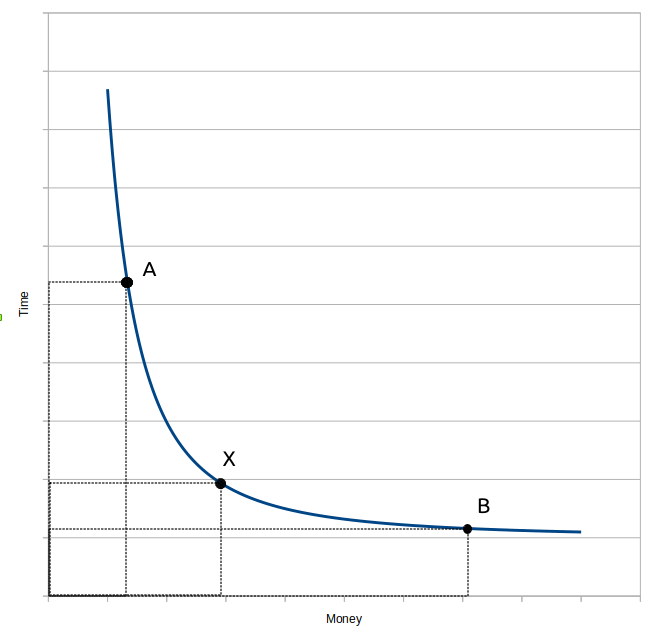 5. The key to clear decision making visually represented at Diagram 1, between different transport modes, is the exchange rate between time and money. If a person believes that one hour is worth $40, s/he may decide differently to a person that believes one hour is worth only $10. But when the person has found the exchange rate, it can measure the “money” in units corresponding to one time unit. For example, one hour will be expressed by one centimetre on the vertical axis and one centimetre on the horizontal axis corresponds to $40. Thereby one can not only proceed with a clear mathematical calculation for the optimisation between time and money, but this will automatically already be expressed geometrically by the graph. In our example, the optimisation takes place slightly left from the point X, thus the train is the optimal mode of transport in terms of time and money. In more abstract terms: the best point on the curve is where the rectangle between the axes and the shortest lines linking the respective dot on the curve where the axes is smallest.