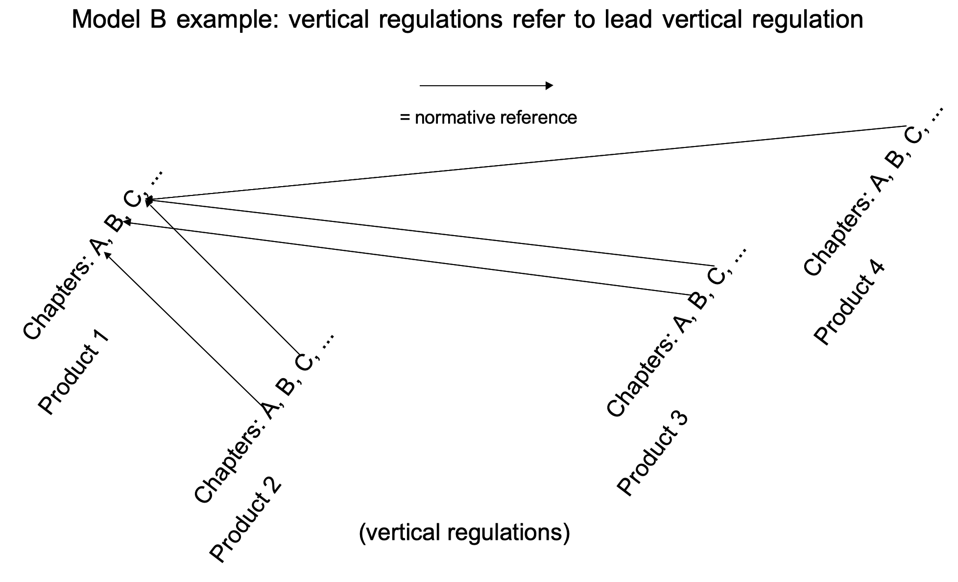10. Model B: Similar to Model A, Model B consists only of vertical acts but in Model B, there is a “lead vertical act” to which the other vertical acts normatively refer to. The normative reference can be triggered by provisions like: “Chapter A of Act XYZ applies” or “Chapter A of Act XYZ applies by analogy”.
